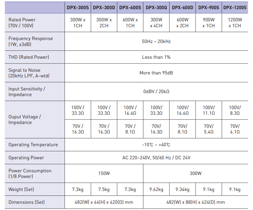 Amply Inter-M DPX SERIES là amply phóng thanh thành công suất cao thuộc dòng D. DPX là bộ khuếch đại bán chạy nhất của Inter-M để sở hữu những tính năng cần thiết cho 1 hệ thống âm thanh. Dòng DPX cung cấp bảy dòng sản phẩm cụ thể là DPX-300S "(300W), DPX-300D" (300W), DPX-600S "(600W), DPX-300Q" (300W), DPX-600D" (600W), DPX-900S" (900W),DPX-1200S" (1200W). Bộ khuếch đại dòng DPX có thể tạo ra công suất cao hơn ngay cả với mức tiêu thụ điện năng thấp hơn đáng kể so với bộ khuếch đại tương tự thông thường và có thể thiết lập một hệ thống thân thiện với môi trường và kinh tế vì nó tạo ra ít nhiệt hơn và trọng lượng nhẹ.
