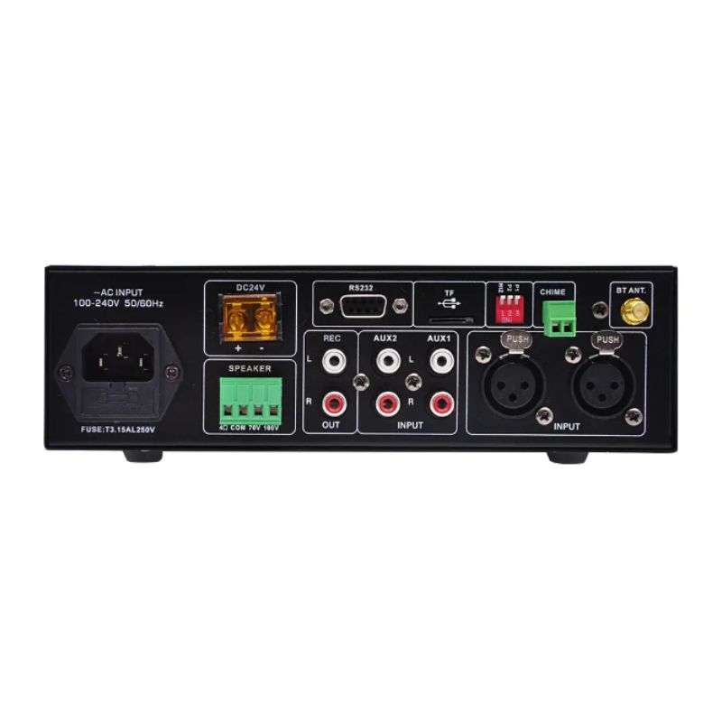 Amply Surpass SP-ME60 có 2 kênh đầu vào Micro XLR cân bằng và 2 đầu vào RCA Aux. Amply có 1 kênh đầu ra RCA cho REC. Amply hỗ trợ kết nối Bluetooth để phát nhạc từ các thiết bị di động.