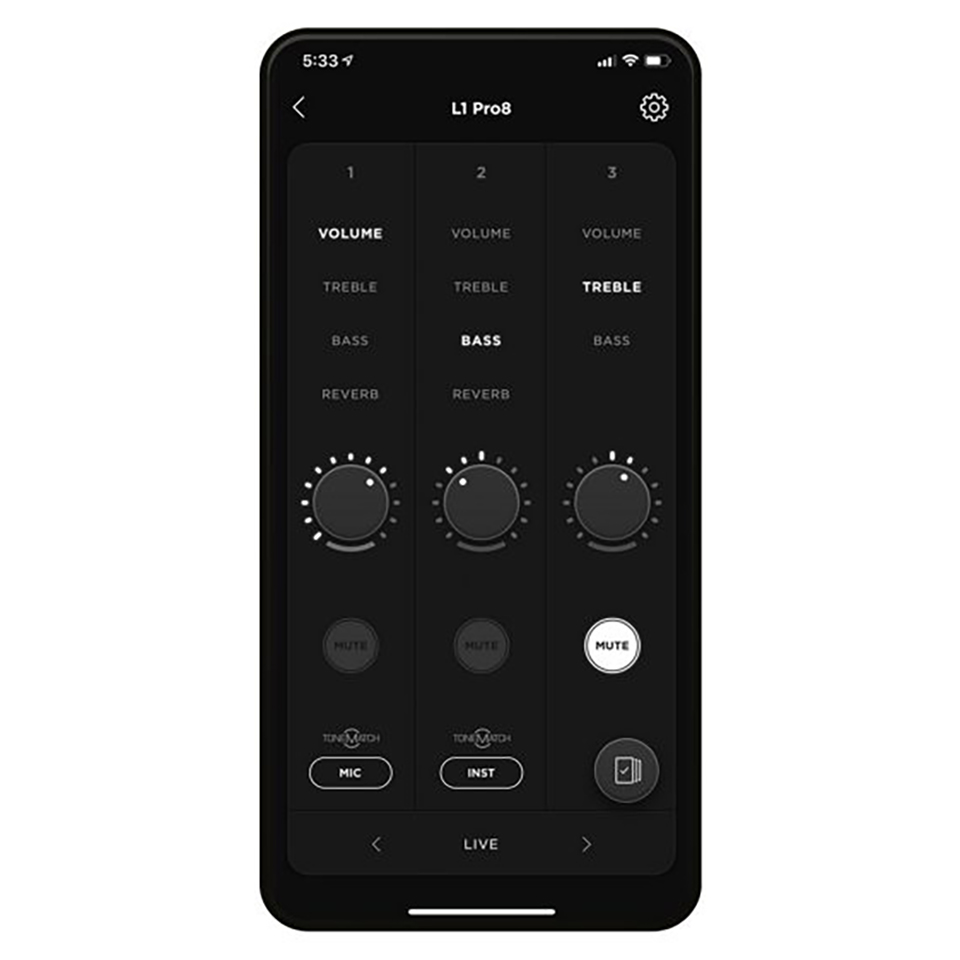 Với ứng dụng L1 Mix, có thể điều chỉnh cài đặt Mixer ngay lập tức từ điện thoại ở bất kì đâu, không gian nào gần loa L1 Pro8 . Thay đổi cài đặt âm lượng và tone trong ứng dụng và đèn LED của hệ thống nút điều khiển trên Bose L1 Pro8 di chuyển để khớp - mixer và ứng dụng luôn đồng bộ hóa theo thời gian thực.