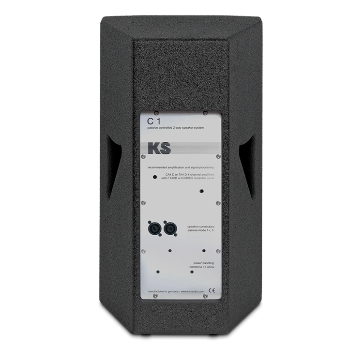 KS AUDIO C 1 , ở đây từ phía sau. Có thể nhìn thấy rõ ràng là hai đầu nối spekON NL4 và tay cầm đơn giản nhưng rất chức năng ở cả hai bên để một người có thể dễ dàng mang loa nhẹ