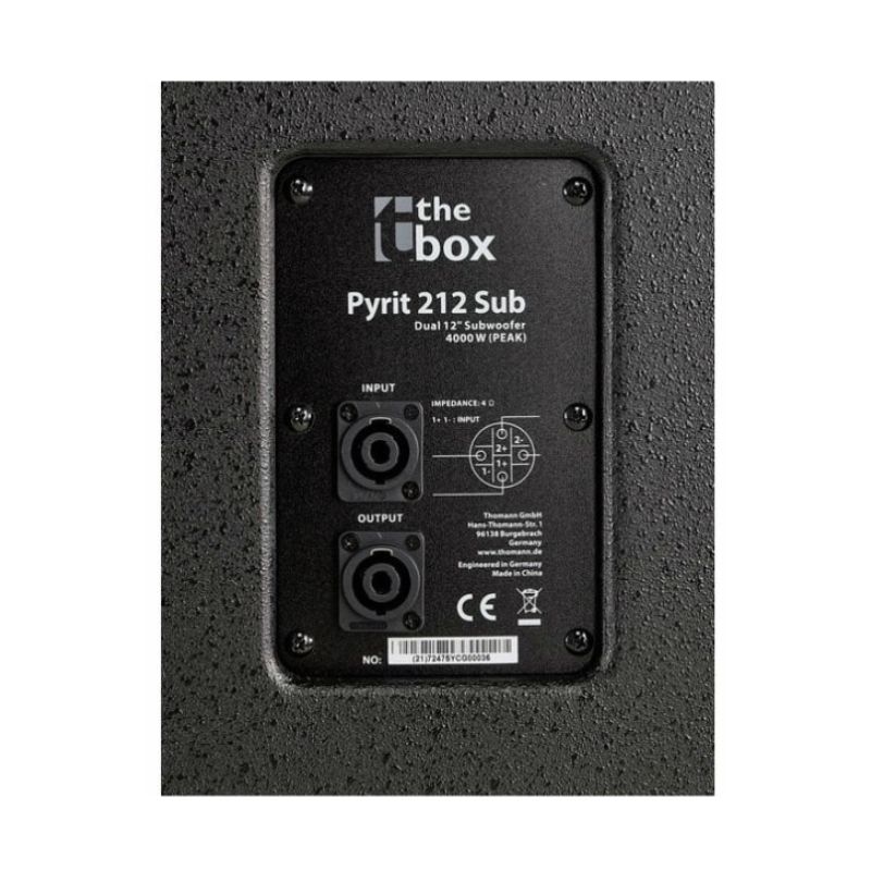 Loa siêu trầm The Box Pyrit 212 Sub được thiết kế với kích thước rất lớn, với hai loa siêu trầm đường kính 12 inch (30,5 cm) mỗi loa với nam châm lớn và cuộn mạch động, giúp tái tạo âm thanh trầm mạnh mẽ và chi tiết. Pyrit 212 Sub được thiết kế với mục đích tăng cường hiệu suất âm trầm, với cổng bass reflex để tối ưu hóa phản hồi âm thanh và độ nhạy. Điều này cho phép loa tái tạo âm thanh trầm mạnh mẽ và sắc nét, đồng thời giảm thiểu hiện tượng méo tiếng và biến dạng âm thanh.