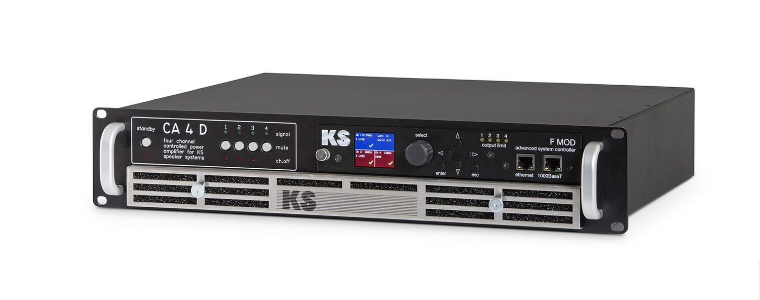 KS AUDIO CA 4D là một giải pháp độc đáo cho tất cả các ứng dụng trong lĩnh vực tăng cường âm thanh chuyên nghiệp. Từ bộ khuếch đại công suất 4 kênh tuyến tính đến “hệ thống pa đa chiều được điều khiển kỹ thuật số”, bạn có thể có được bất kỳ cấu hình khả thi nào bằng cách chỉ cần thay đổi chương trình trên F MOD hoặc bằng cách tải một chương trình khác vào D MOD bằng cách sử dụng thẻ nhớ USB.