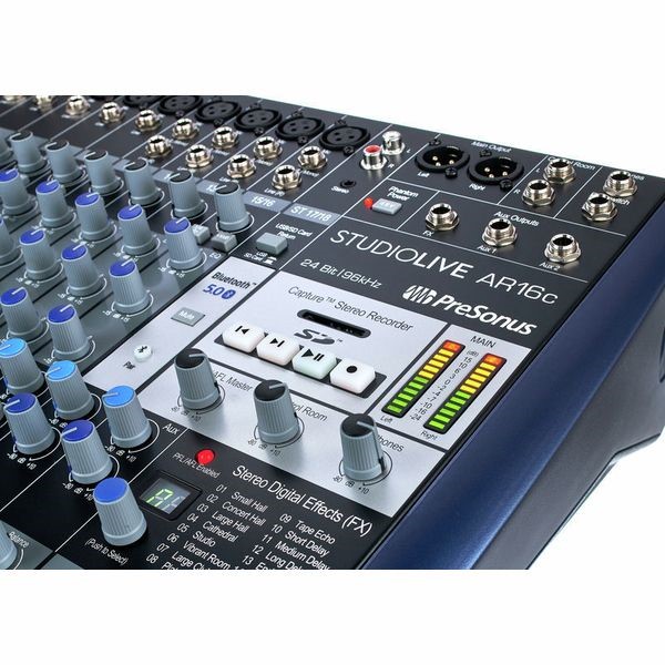 Đừng để thiết kế bộ trộn analog cổ điển đánh lừa bạn—StudioLive® AR16c được chế tạo để ghi âm. Với mặt trước tương tự nguyên sơ, 12 tiền khuếch đại mic XMAX độ lợi cao và giao diện âm thanh USB 2.0 tương thích USB-C 18x4 24 bit, 96 kHz, thiết kế kết hợp của nó giúp bạn dễ dàng ghi lại các sản phẩm phòng thu và kết hợp các chương trình trực tiếp từ một giao diện điều khiển trực quan duy nhất. Thêm EQ tương tự 3 băng tần âm nhạc, tăng cường mic/đường truyền cho micrô phát sóng và synths cổ điển ở mức độ thấp, hiệu ứng kỹ thuật số hoàn toàn mới với âm vang phong phú và độ trễ tốt, kết nối Bluetooth® và đầu ghi âm thanh nổi SD... và bạn có một nhà máy trộn và ghi âm đáp ứng nhu cầu của cả nhạc sĩ hiện đại và người sáng tạo nội dung
