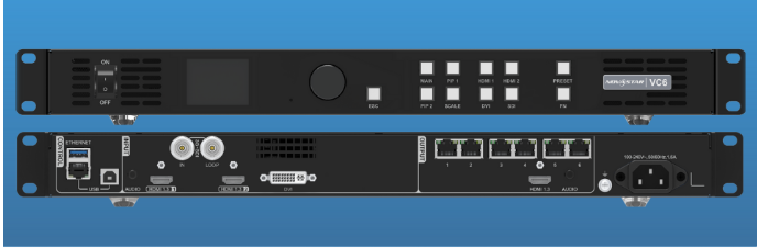 VC6 là bộ điều khiển LED all-in-one của NovaStar, tích hợp đồng thời bộ xử lý video và bộ điều khiển màn hình LED trong một thiết bị 1U gọn nhẹ. VC6 trang bị 6 cổng Ethernet cùng HDMI monitoring out, tải tối đa ~3.9 triệu điểm ảnh với kích thước tới 10,240 × 8,192 pixel, thích hợp cho các màn hình cỡ trung đòi hỏi vận hành ổn định, dễ cấu hình.
